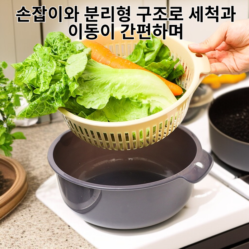 ● 이중 배수구 디자인으로 물빠짐이 탁월해 신선한 과일과 채소를 오랫동안 신선하게 보관할 수 있습니다. ● 넉넉한 용량과 튼튼한 구조로 다양한 식재료나 주방 소품을 깔끔하게 정리할 수 있어 주방 공간 활용에 탁월합니다. ● 손잡이와 분리형 구조로 세척과 이동이 간편하며, 위생적으로 사용할 수 있어 바쁜 주부들에게 꼭 필요한 아이템입니다. ● 고급 플라스틱 소재로 제작되어 내구성이 뛰어나고, 깔끔한 디자인으로 어느 주방에나 잘 어울립니다.
